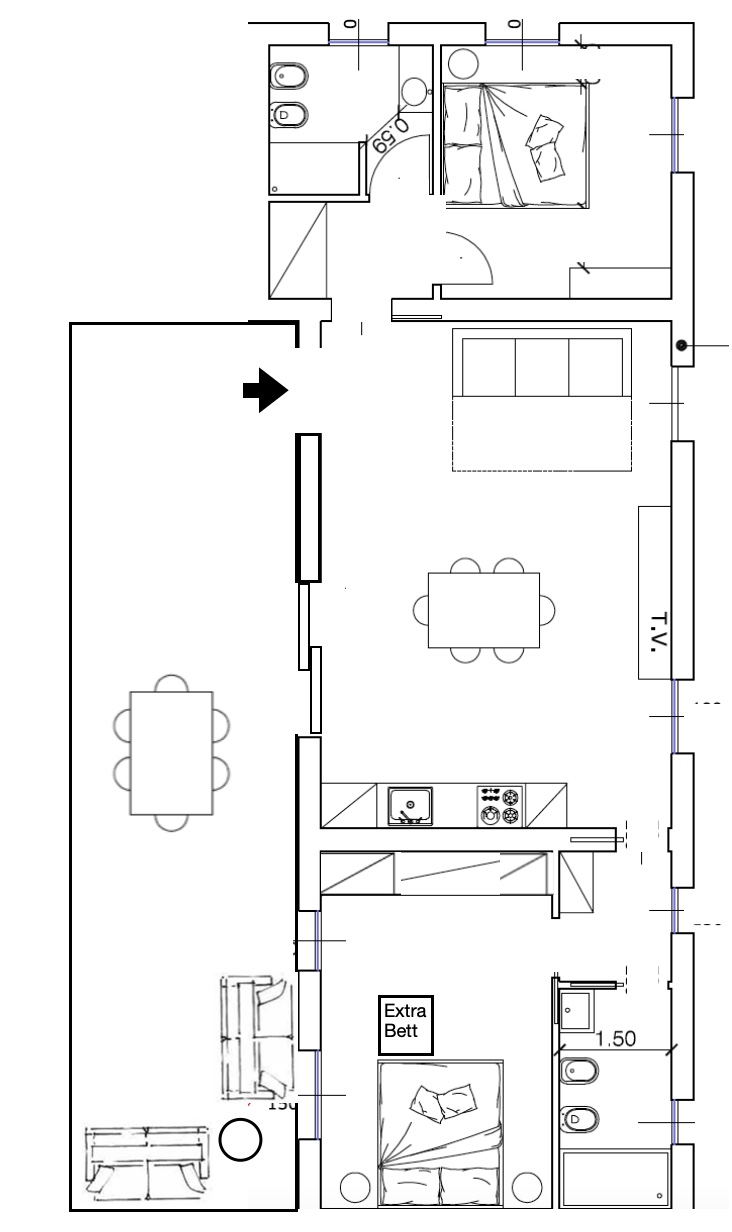 L'appartamento n. 1 (fino a 7 pers.) della nostra nuova Villa Ulivi (dove arte e fiori trionfano) con piscina e ampio giardino è al primo terra e ha un giardino privato recintato oltre a terrazza attrezzata con tavolo e divani, 2 camere matrimoniali (in una si può aggiungere un letto singolo extra), 2 bagni con doccia, soggiorno con divano letto per 2 (160 mt) e cucina (con lavatrice, forno, lavastoviglie), aria condizionata, riscaldamento, TV satellitare, Wi-Fi, barbecue, cassaforte, parcheggio coperto, PISCINA (in comune con gli altri 2 appartamenti).