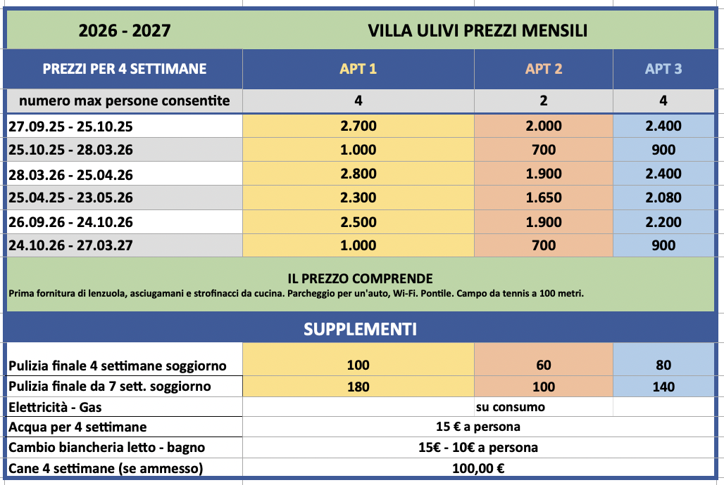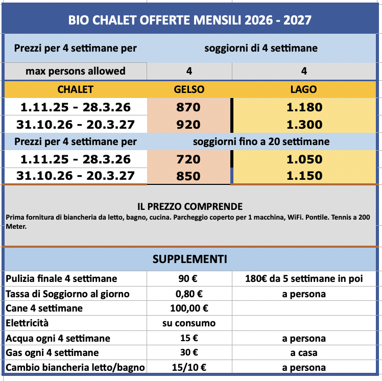 PREZZI MENSILI BIO CHALETS - VILLA ULIVI